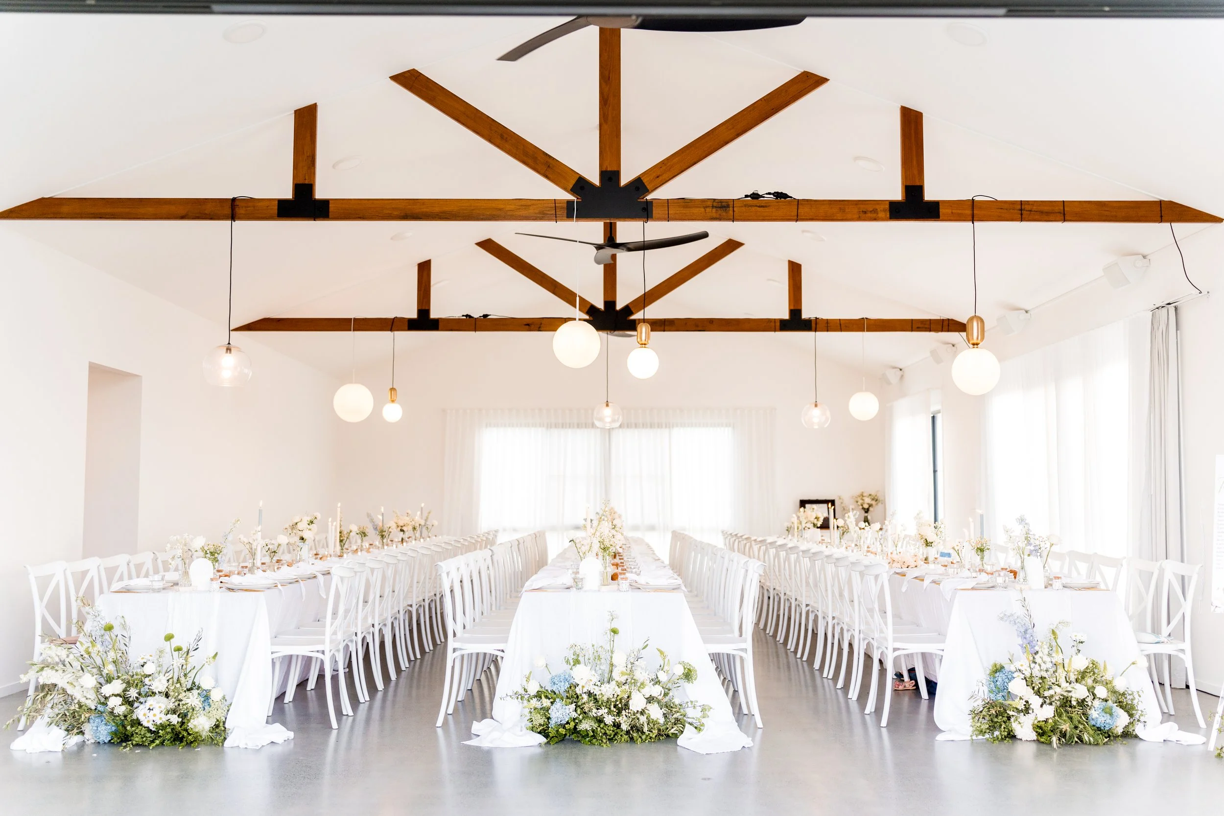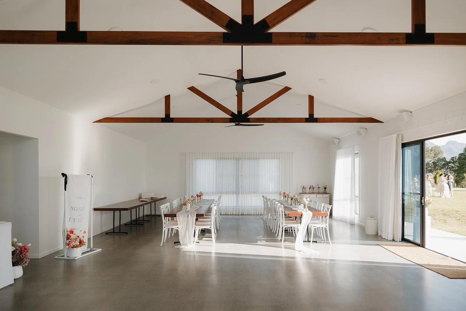 8M WIDE BY 15M LONG OUR AIR CONDITIONED BLANK CANVAS RECEPTION ROOM CAN SEAT UP TO 120 GUESTS, WITH AN OUTDOOR DANCE FLOOR. IT IS MOST COMFORTABLE TO HOST APPROX 80-90 GUESTS SEATED WITH ROOM FOR A DANCE FLOOR AND ENTERTAINMENTS ETC. BATHROOMS ARE LOCATED DOWN THE HALWAY TO THE LEFT OF THE BELOW IMAGE. PHOTO BY @ASHHUGHESPHOTOGRAPHY